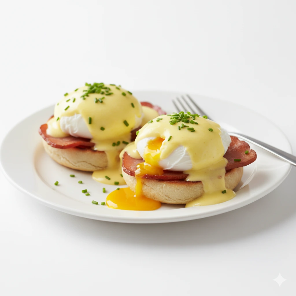 Poached eggs, Canadian bacon, hollandaise, English muffin, breakfast potatoes